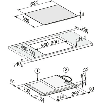 Ausschnittmaße in mm (Tiefe) bei aufliegendem Einbau: 490 mm