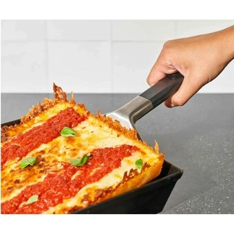 Extra-dünne Klinge mit abgeschrägter Kante, um auch den knusprigsten Käse zu schneiden und Pizzen mühelos aus dem Blech zu holen.