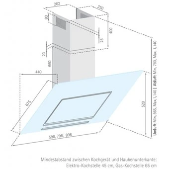 Mindestabstand zwischen Kochgerät und Haubenunterkante: Elektro-Kochstelle 45 cm, Gas-Kochstelle 65 cm
